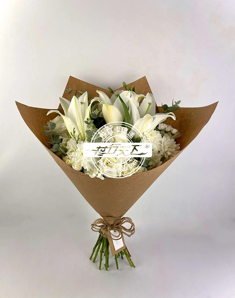 白百合花、白玫瑰、白菊花等组成、精美包装.