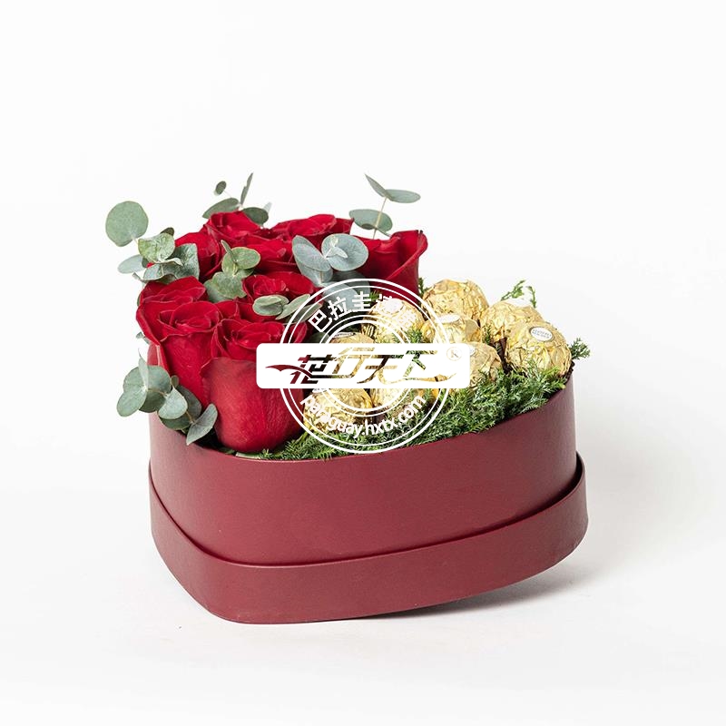 红玫瑰、9颗费列罗巧克力、心型礼盒装.