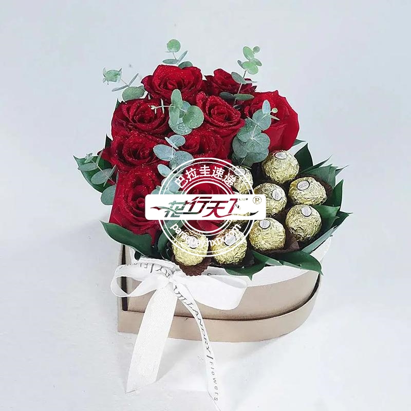 9枝红玫瑰、9颗费列罗巧克力、心型礼盒装.